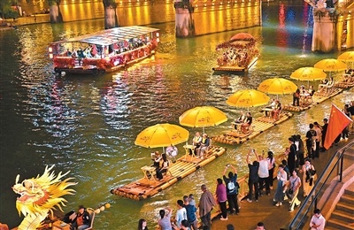 10月3日晚,游客在湖北省宣恩县贡水河体验“龙游贡水”竹筏项目。宋 文摄(新华社发)
