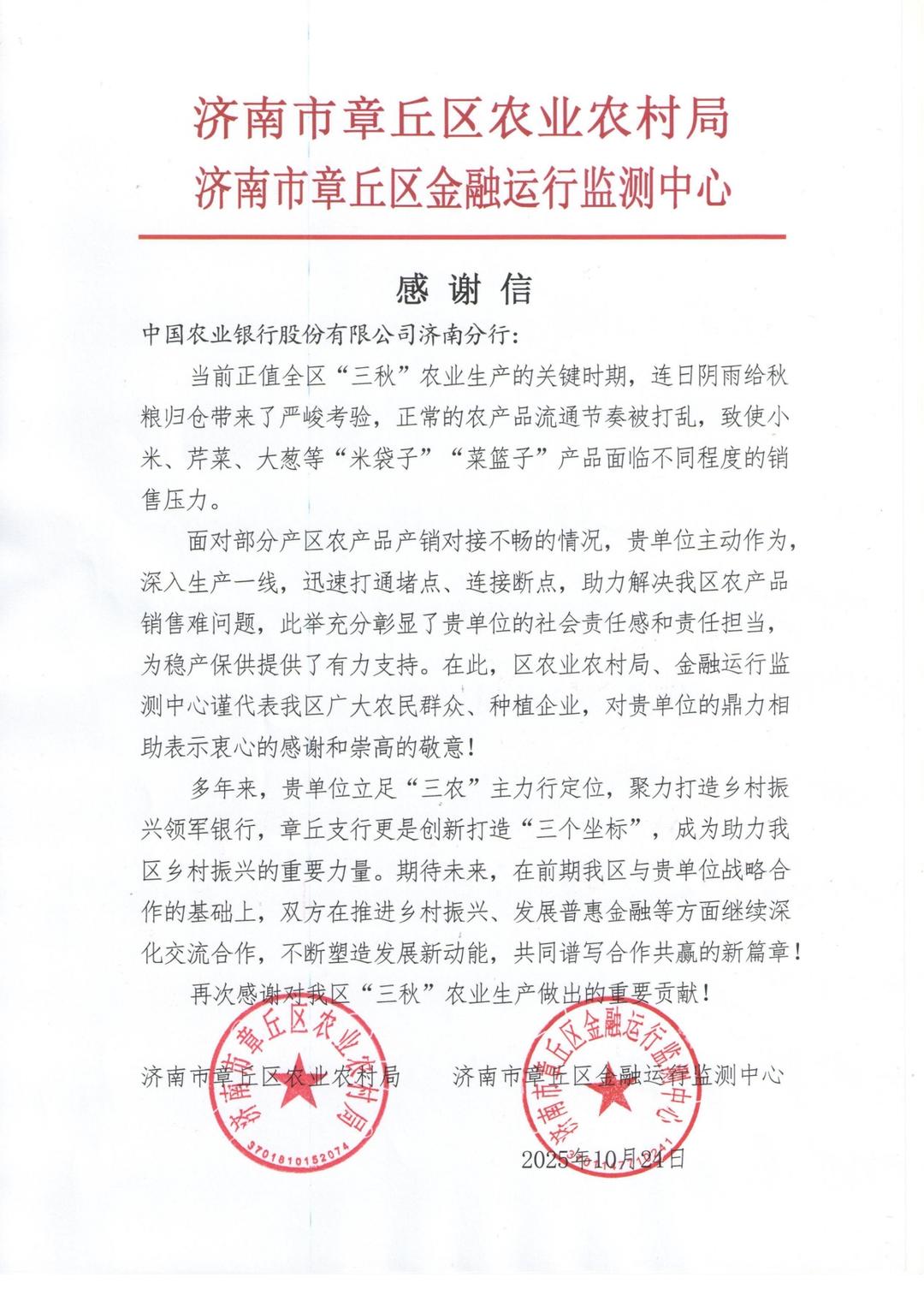 济南市章丘区农业农村局、章丘区金融运行监测中心向农行济南分行送来感谢信创达盈配资。