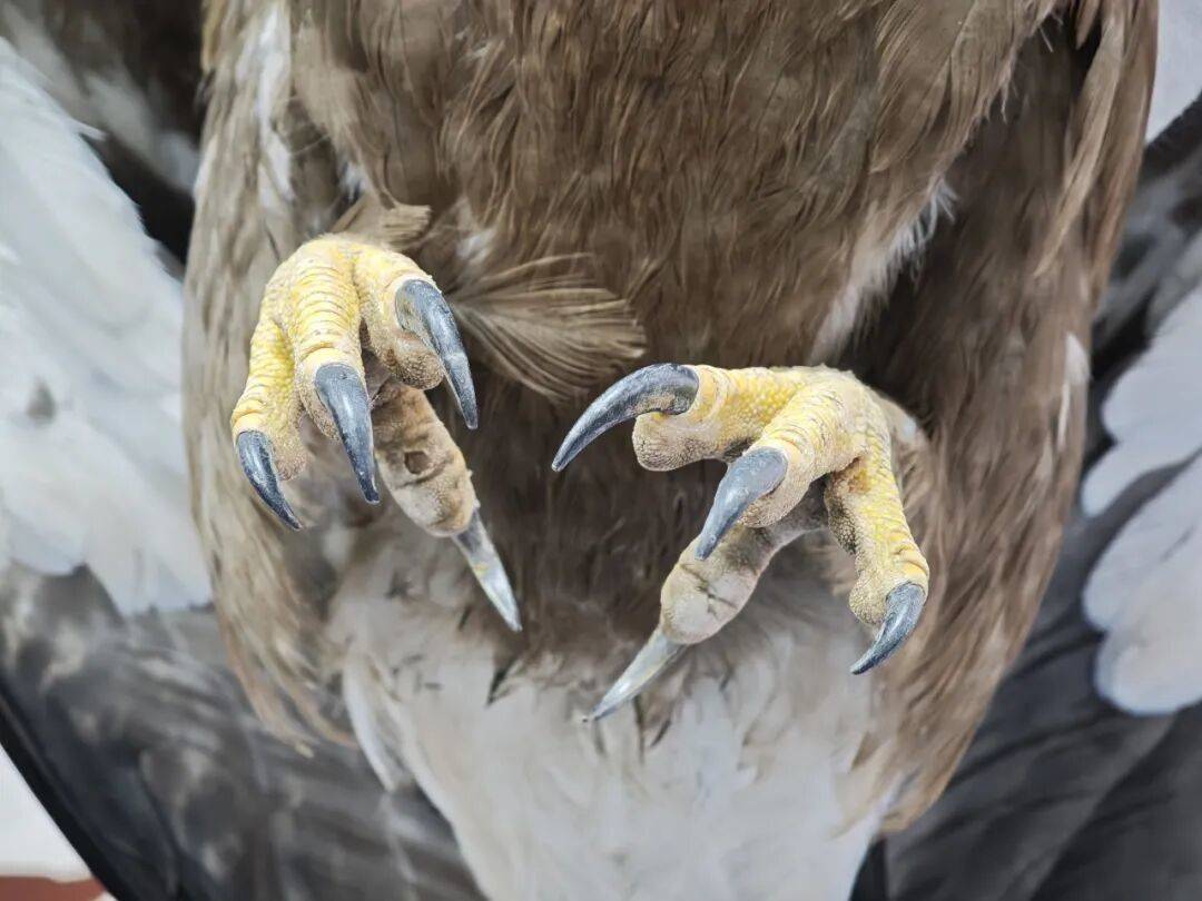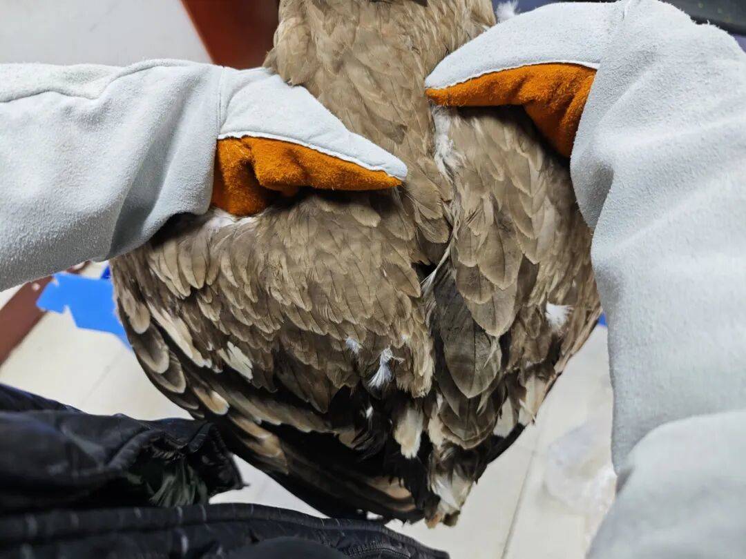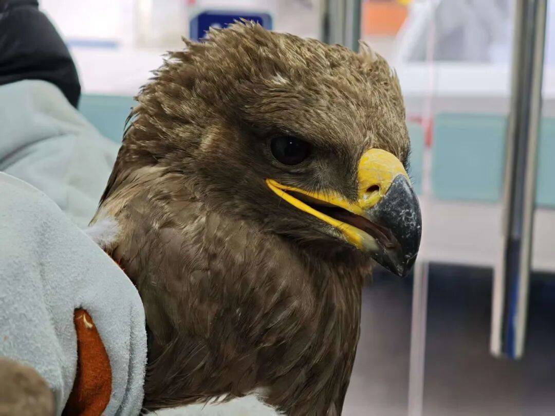 这只鸟体型硕大,体羽以褐色为主,头部小而突出,喙锋利且呈钩状。虽暂时失去了飞行能力,但眼神依旧冷峻凶猛,威风凛凛。经过判断,这是一只国家一级保护动物草原雕。梅胜福小心地将这只猛禽暂时安顿,希望能帮助它恢复体力。